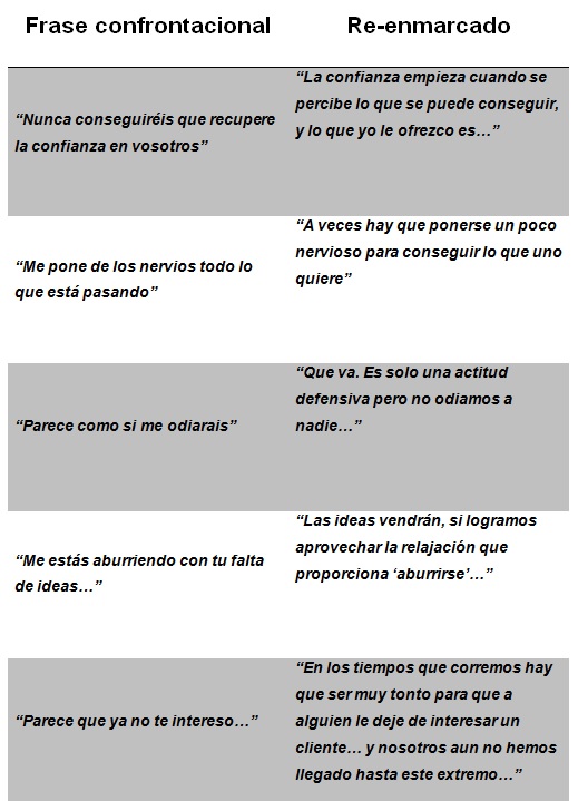 La técnica del re-enmarcado es muy útil, para conseguir transformar las percepciones negativas que evoca una determinada propuesta negociadora, en algo positivo, digerible y eventualmente aceptable por la otra parte, creando escenarios más cercanos al logro de la satisfacción mutua.